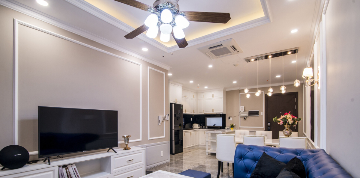 Tông màu trắng nhã nhặn trong phong cách cổ điển, phối kết hợp hài hòa với bộ ghế sofa có đường cong quyến rũ. Các họa tiết trên tường và trần, bàn trà và hệ thống đèn tôn lên vẻ đẹp hài hòa cho tổng thể.
